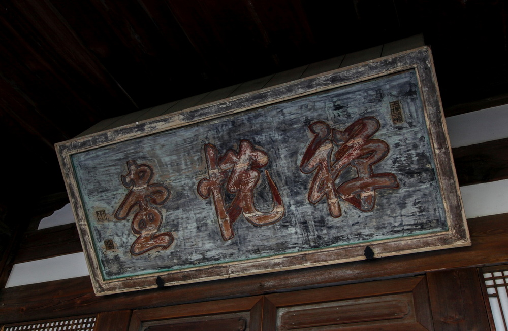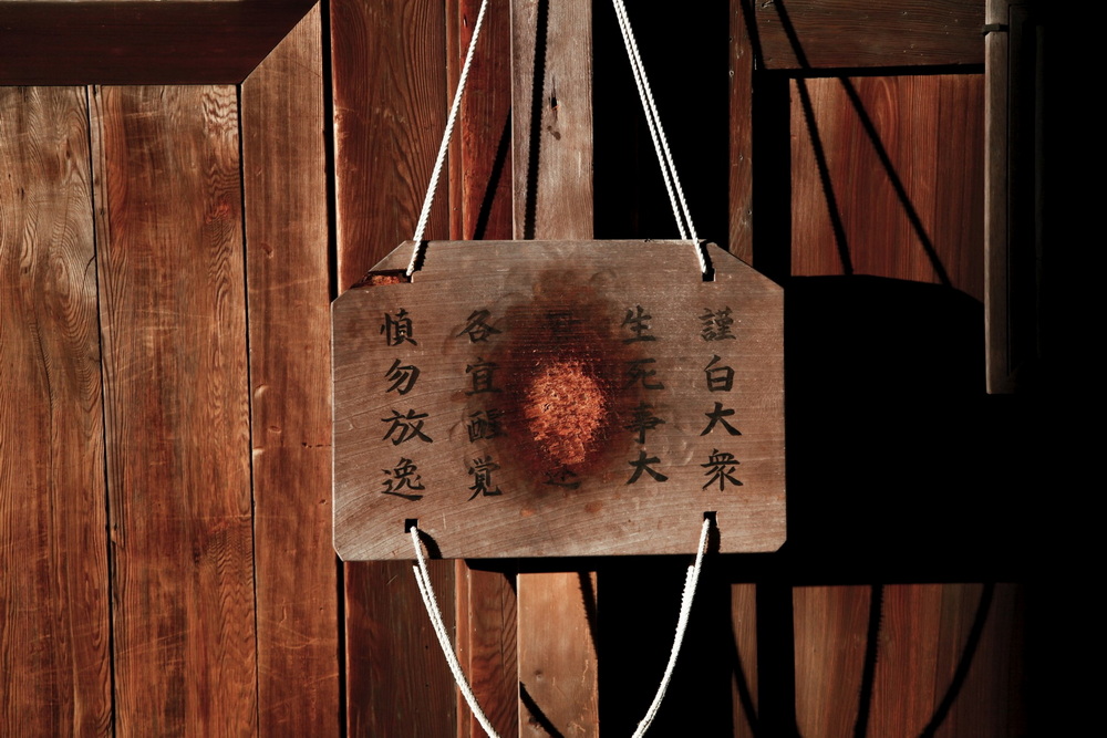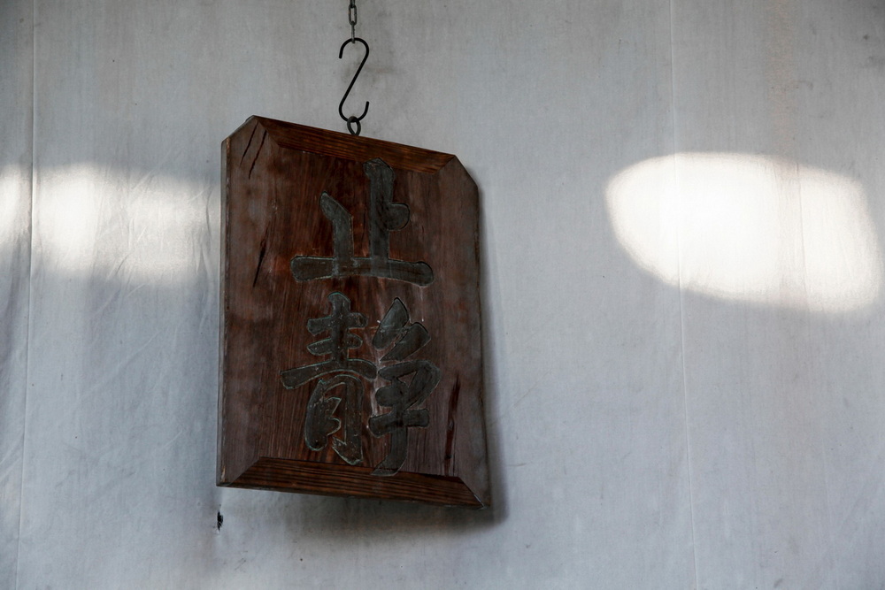 禪堂門口的牌子,坐禪時掛“止靜”牌,非坐禪時掛背面的「放參」牌。