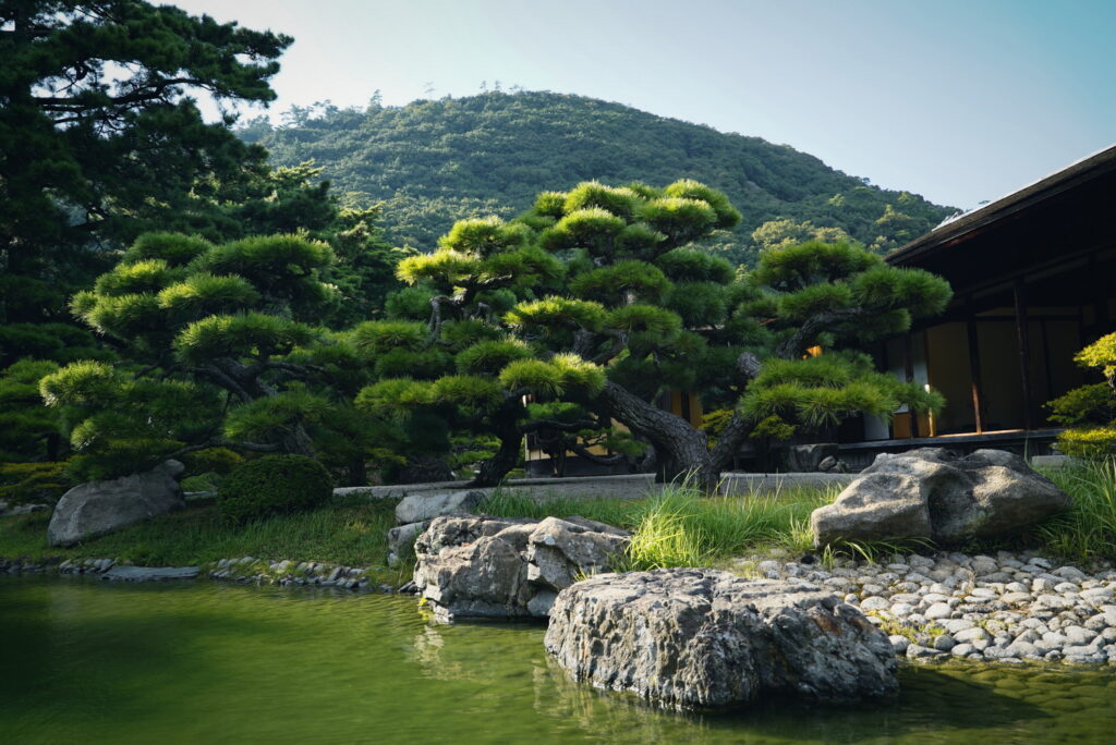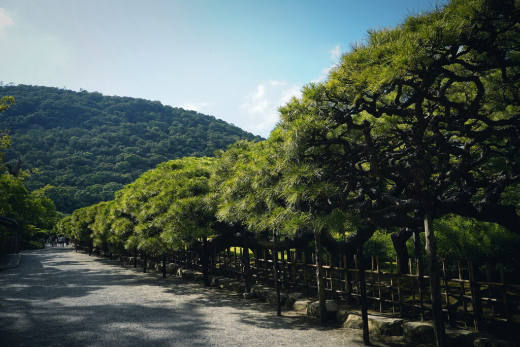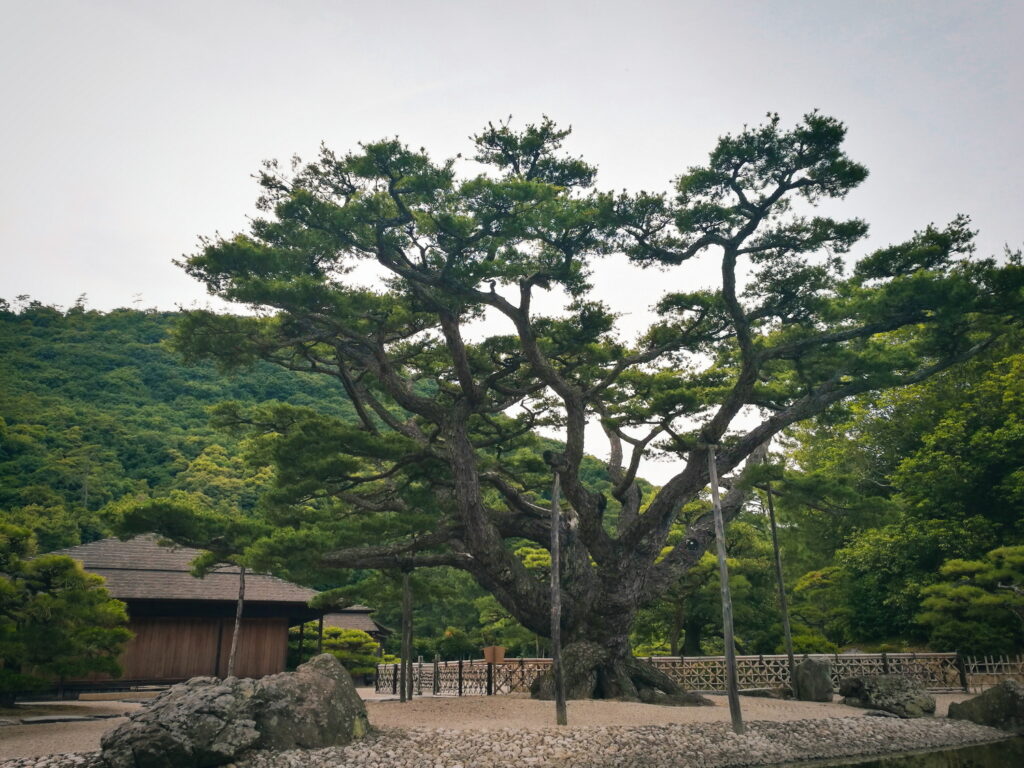 除此之外,庭園中生長的1400餘棵松樹盡顯蒼勁古拙之美,這當中大約1000棵都是出自于匠人的親手修剪。這些松樹大多都是在庭園建造早期種植的,距今已有三百多年。其中被譽為栗林公園三大松樹美景之一的「根上行五葉松」,如今已是一棵高約8米、繞樹幹約35米的巨木,可誰又能想到兩百年前,它僅是第十一代德川將軍所賜的一株小盆栽。