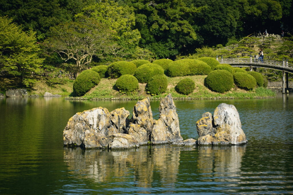 早在松平藩主時代,庭園中被命名的景點就有六十處之多。看這些名字:小普陀、鹿鳴原、日暮亭、杜鵑嶼、飛猿岩、枕流亭、鶴龜松、偃月橋、赤壁、涵翠池、鳳尾塢、芙蓉沼、掬月亭、飛來峰……都帶著濃厚的中國文化印記。